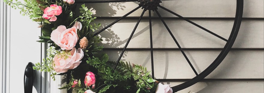 Saw this beautiful wheel at Michaels while looking for other wreath forms. A little unconventional but I think I love it! Let me know what you think of my floral additions!